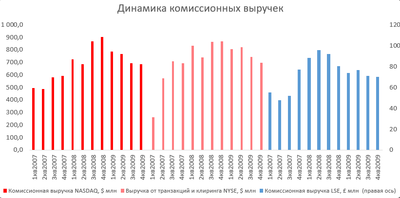 Не стала исключением и Нью-Йоркская биржа NYSE. У неё прослеживалась аналогичная динамика. В 2008 количество обработанных сделок выросло на 17% г/г и затем упало на 8% г/г в 2009 году.
