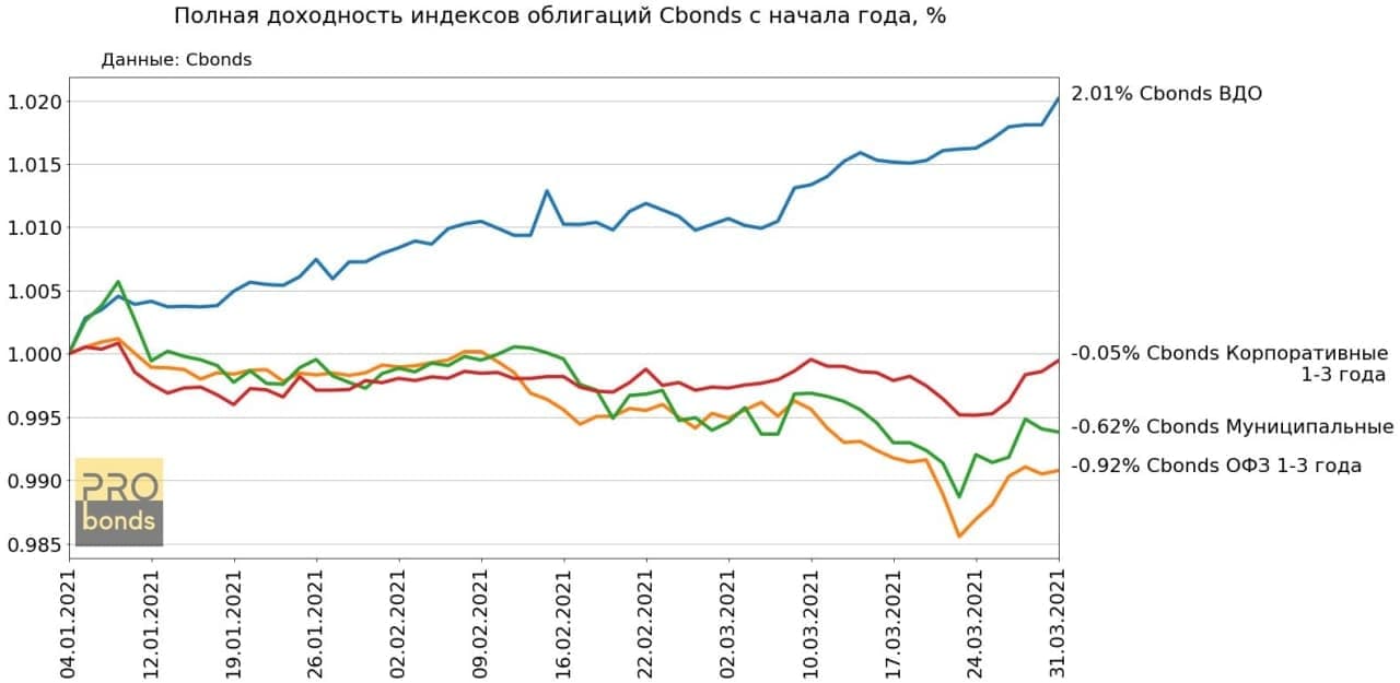 На 31.03. Индекс ВДО единственный показывает положительную доходность с начала года +2.01%. ОФЗ теряют -0.92%, Муниципальные облигации -0.62%, а Корпоративные -0.05%