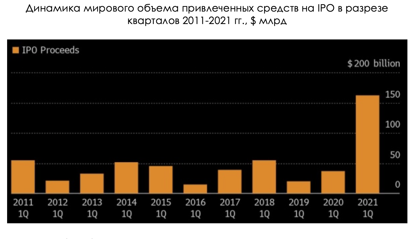 Мировая IPO эйфория продолжилась и в начале 2021 года, когда за первые 2 месяца 2021 года было привлечено средств, как за весь 2016 год. Однако это индикаторы, которые показывают прошлое, если бы мы смотрели в зеркало заднего вида автомобиля и ориентировались по нему.
