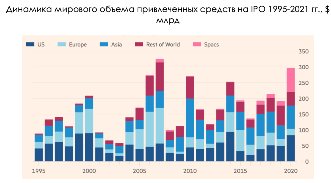 На графике видно, что основной рост объема привлеченных средств через классическое IPO приходился на США и Азию, тогда как в Европе спрос на IPO снизился. Низкая стоимость денег и высокий уровень ликвидности в экономике подстегнули спрос на «быстрые» деньги практически в конце очередного витка роста цикла.