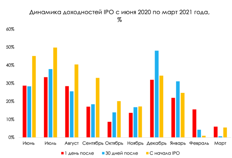 В качестве опережающего индикатора мы решили взять динамику акций компаний, которые вышли на IPO c февраля 2021 года, и сравнить динамику всех вышедших IPO с июня 2020 года по март 2021 года.