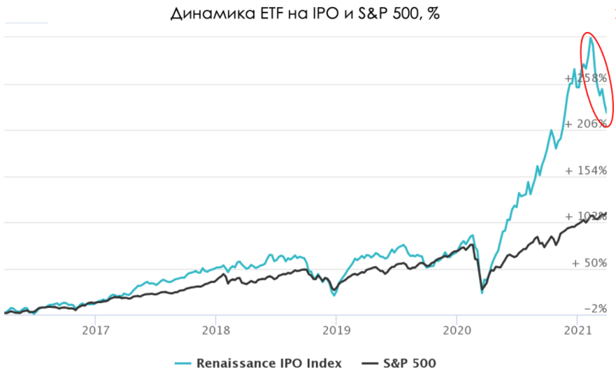 Постепенную потерю интереса инвесторов к IPO из-за все более частых убытков также показывает ETF на IPO от инвестиционной компании Renaissance Capital (тикер: IPOUSA). С 15 февраля до 29 марта 2021 года индекс IPO снизилcя на 25%. Стоит отметить, что подобной перегретости сектора не наблюдалось ни на одном цикле IPO финансирования. Из-за перегретости рынка IPO многие компании просто откладывают момент выхода на биржу до более благоприятной рыночной конъюнктуры. Например, 31 марта 2021 года, стало известно, что холдинг Kultura перенес IPO на неопределенный срок.