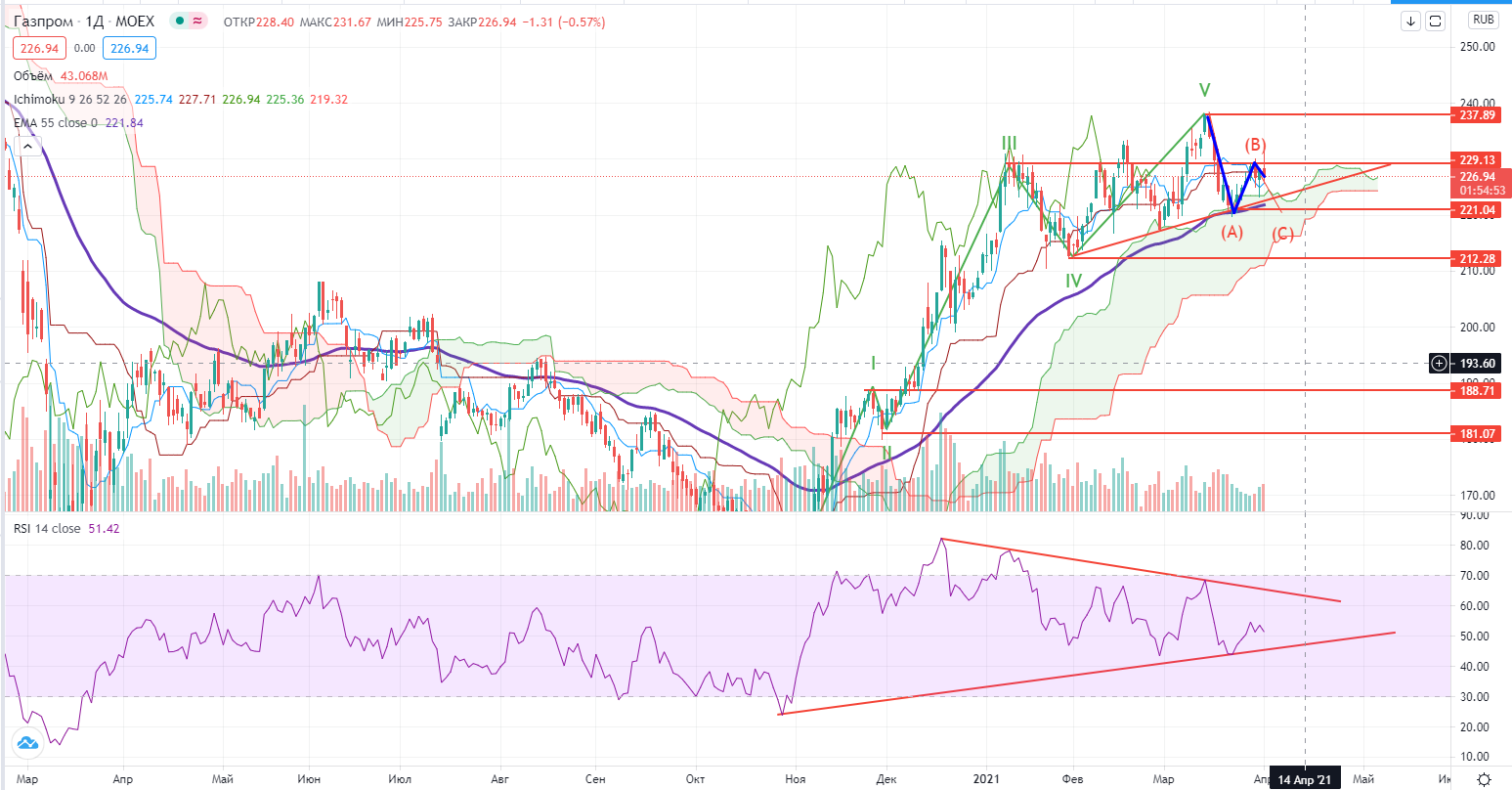 В Газпроме тоже было очень позитивное утро и тоже произошел отлив. Пока не ясно, начало ли это волны С, или нет, ситуация сильно запутана, надо смотреть за развитием событий, пока любая позиция возможна...