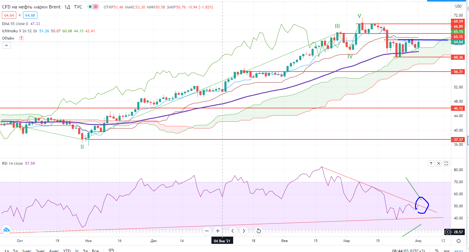 И вроде как это плохо для нефти, и она в моменте сильно падала, но под вечер начала расти, да так сильно, что вышла в неплохой плюс… Снова-корова, пила, причем жесточайшая… Я боюсь предположить уже, но проход $65,16 на днях может привести к сильнейшему выкосу наверх, вплоть до $69±. ( https://www.finam.ru/analysis/marketnews/neft-sdelala-popytku-sdut-puzyr-20210329-09450/). Короче пила жестокая продолжается, и стоить отметить, что сегодня пятница, а значит конец недели, и может легко прийти подтверждение разворотной формации на неделе… Интрига №1.