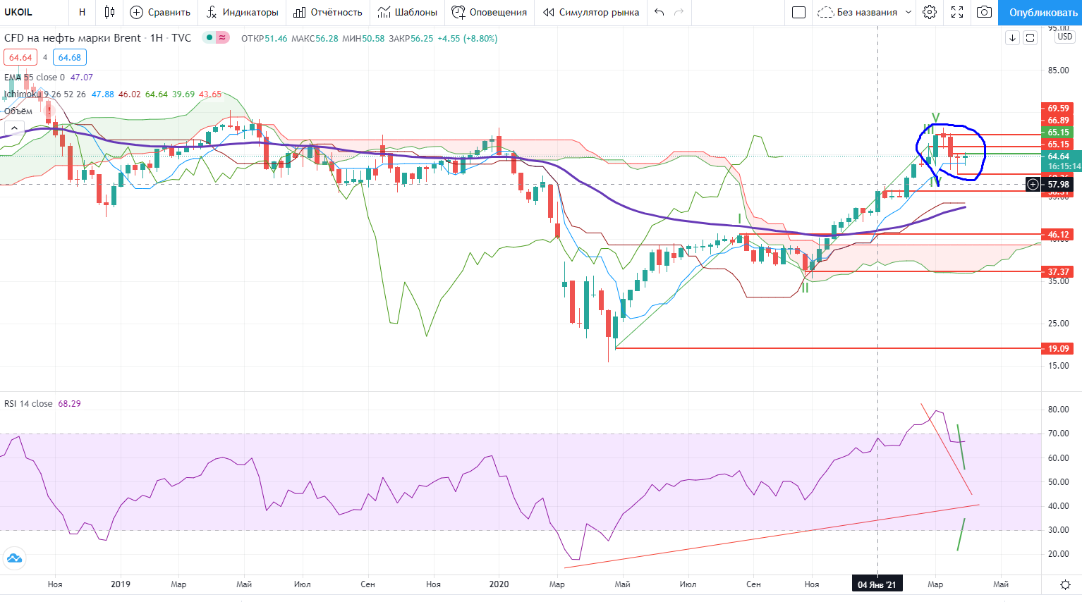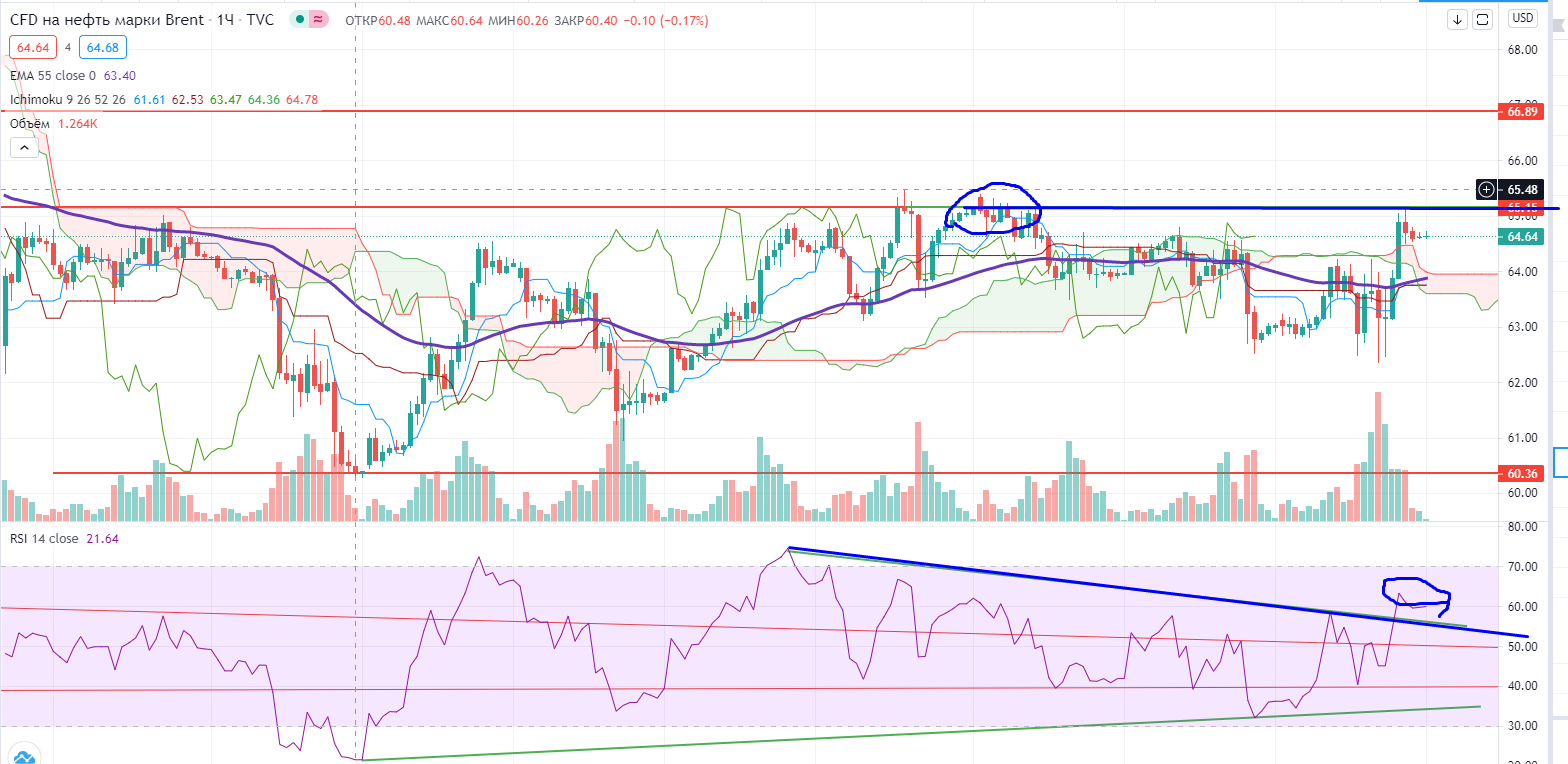 Нефть на споте на часах можно с коротким стопом покупать при закреплении выше 65,2+ (стоп 65-)..На днях-этот же уровень-65,2+, RSI пока под трендом, но в случае пробоя сегодня есть шанс увидеть пробой тренда и там…И наконец Нефть неделя, сегодня пятница, и если она нарисует белую свечу, то возможно нарисуется разворотная формация вверх… Тем более что на недельных она пока в волне IV..