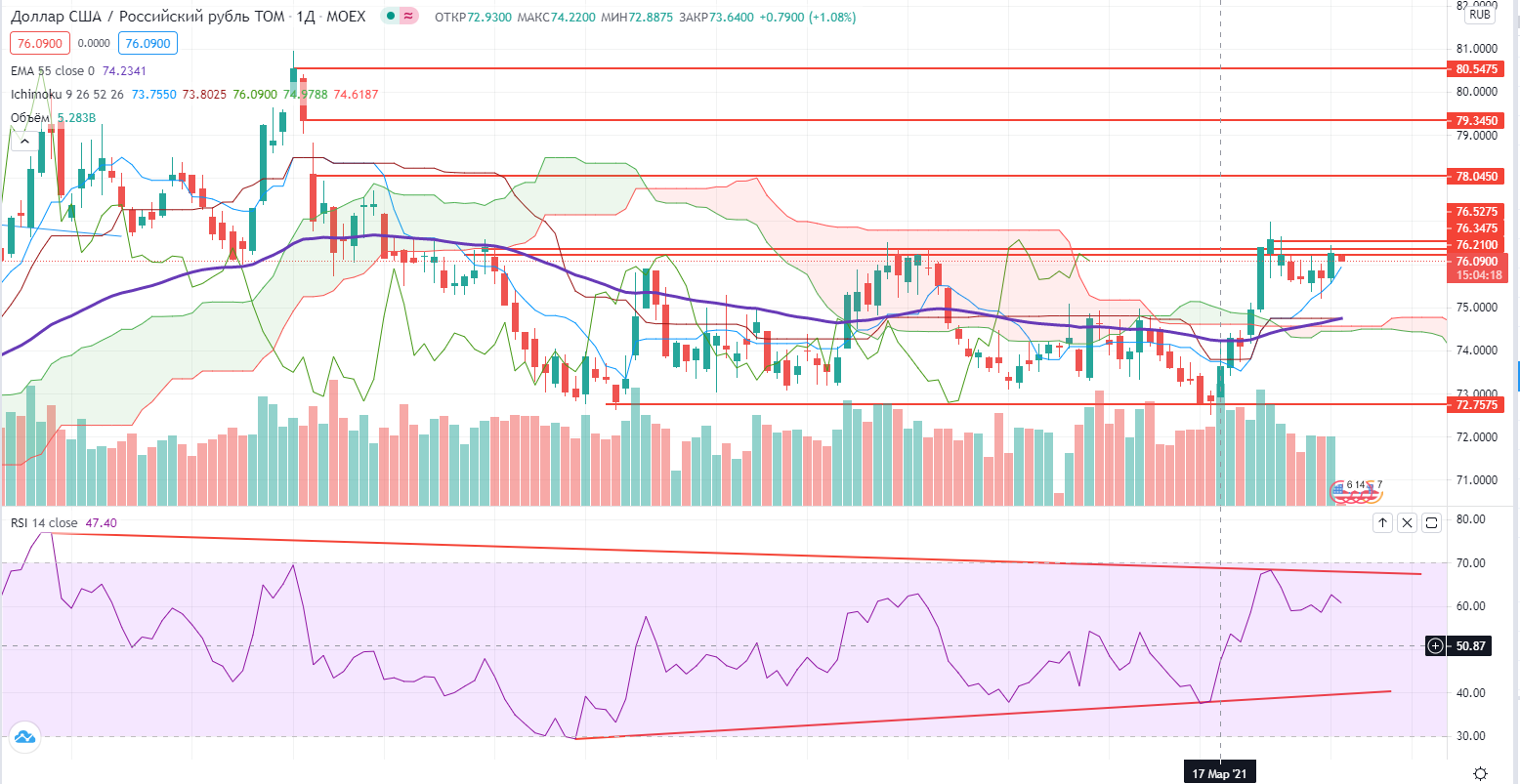В паре доллар/рубль также в моменте нарисовался рост, но он немного поутих на нефтяном отскоке… Но не сильно, что вызывает некоторые сомнения. Пока не пройден уровень 76,6+ говорить о росте рано, да и при пробое далеко не факт, что рост продолжится. Очень странная ситуация, но если покупать доллар, то лучше на ретесте пробоя с коротким стопом…