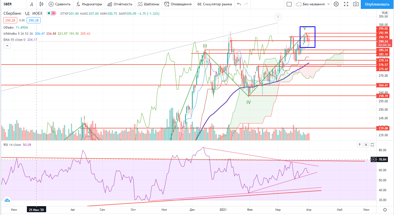 В Сбере после позитивного открытия он все-же не удержался на хаях и продолжил падение… Правда остановился почти на предыдущем закрытии, т.е. на локальном лоу. Ситуация неоднозначная, уж больно волатильность высокая. Риски есть как от лонга, так и от шорта, по крайней мере на этих уровнях… Надо ждать чего-то, когда волатильность возрастает, это часто бывает предвестником сильного движения..