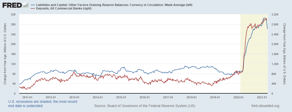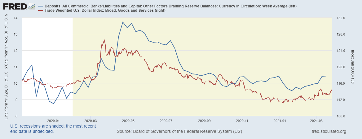 Синяя линия – это соотношение депозитов к наличным деньгам, по сути, если отбросить нюансы, то это один из денежных мультипликаторов. И мы видим, что показатель нарастает, что выступает в пользу поддержки доллара, который нанесен красной линией.