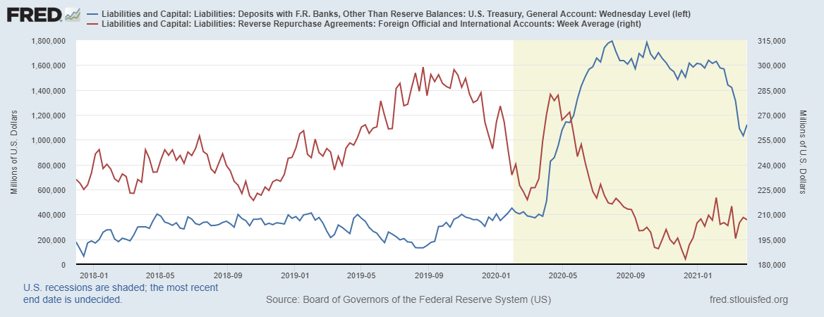 Синяя линия – счет Казначейства США в ФРБ. На текущей неделе счет подрос на 90 млрд долларов.