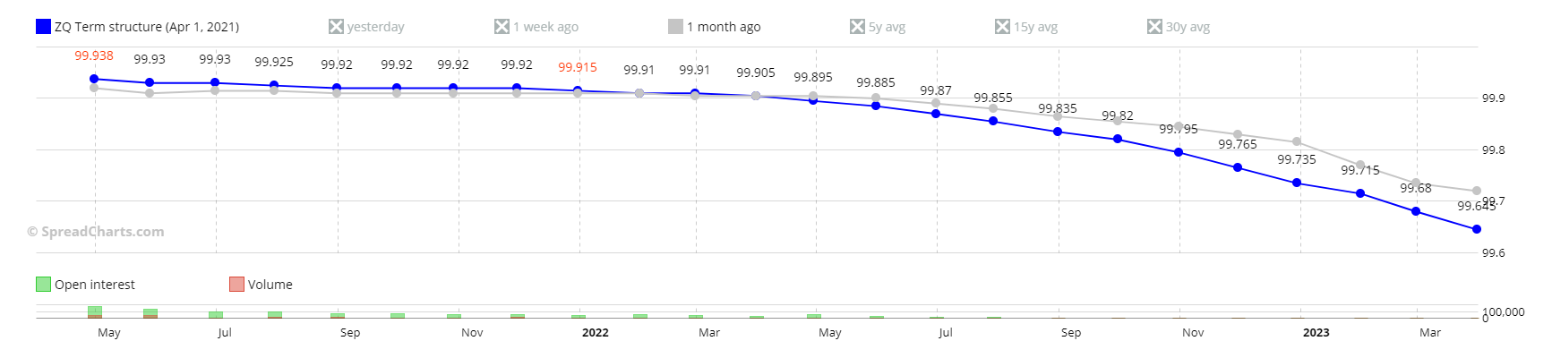 Относительно денежного рынка спокойны и участники финансового рынка, на картинке ниже фьючерсная кривая по 30-дневным векселям, торгующимся на СМЕ