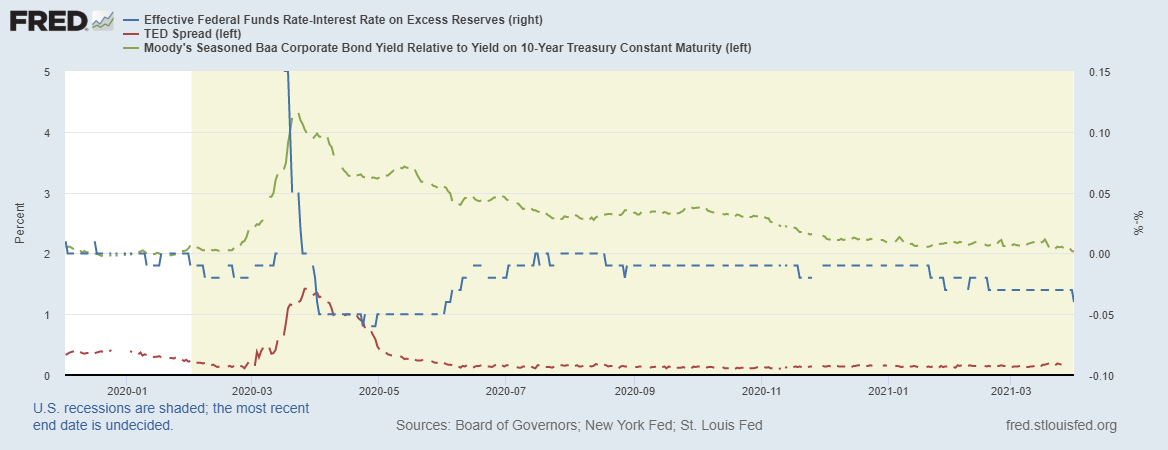 Зеленая линия – это разница между доходностью корпоративных 10-летних облигаций и соответствующих трежерис, ситуация на рынке корпоративного долга стабилизировалась на докризисных уровнях, и на прошлой неделе показатель снизился еще.