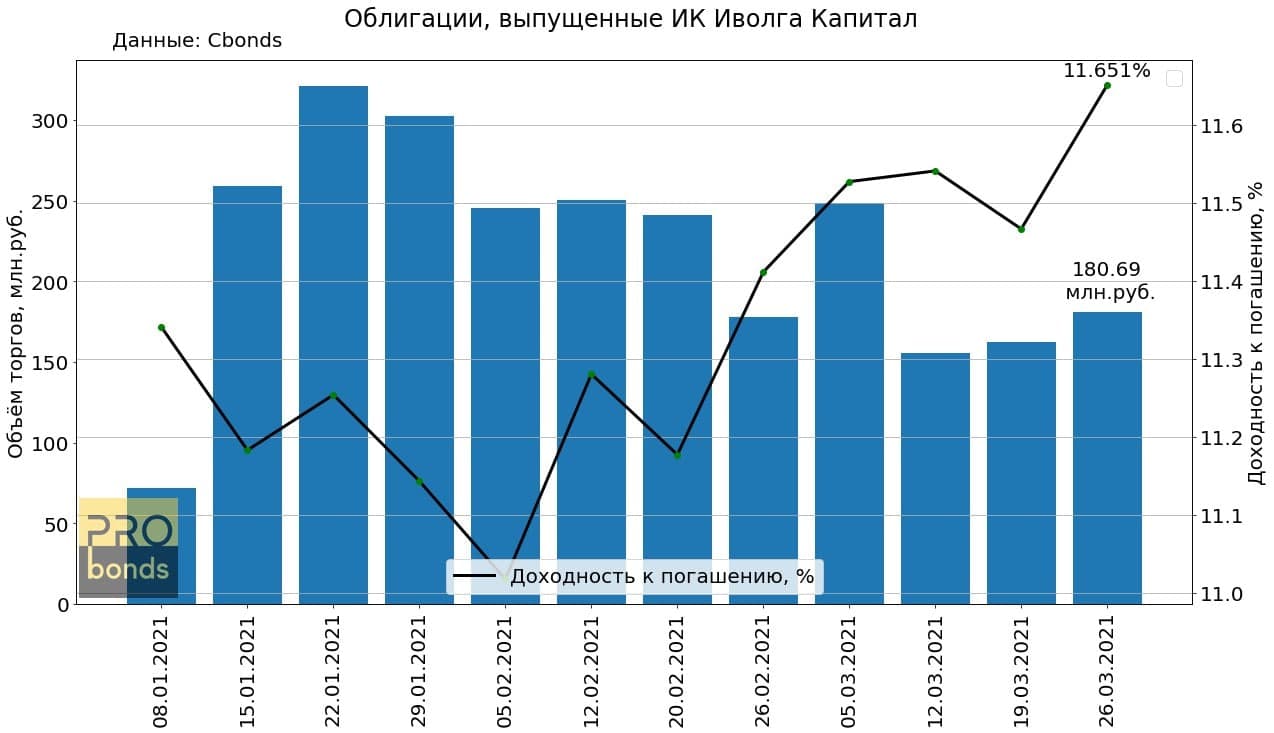 Торговый оборот облигаций, размещенных ИК Иволга Капитал, за прошедшую неделю составил 180.69 млн.руб. (+11.15 % н/н) Средний оборот по бумаге 6.45 млн.руб. Средняя доходность к погашению выросла по сравнению с прошедшей неделей до 11.65%