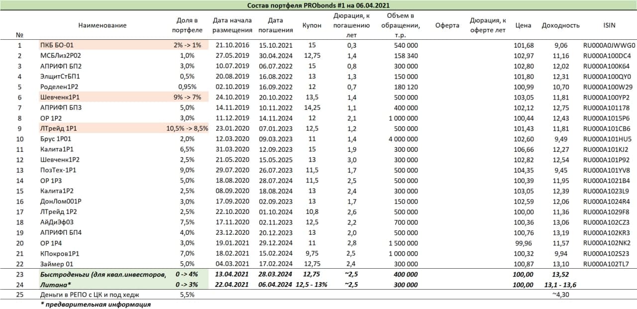 В портфелях в ближайшие недели добавятся новые облигации, а часть старых выпусков будет сокращена. С 13 апреля на 4% от активов планируется добавление нового выпуска МФК «Бвстроденьги» (400 млн.р., 3 года без амортизации, ориентир купона 12,75%, выпуск для квалифицированных инвесторов). Во второй половине апреля – добавление на 3% от активов облигаций строительной компании «Литана» (300 млн.р., 3 года, ориентир купона 12,5-13%). Поскольку в портфелях уже есть свободные деньги, то под новые размещения будет сокращен очень ограниченный объем старых выпусков.