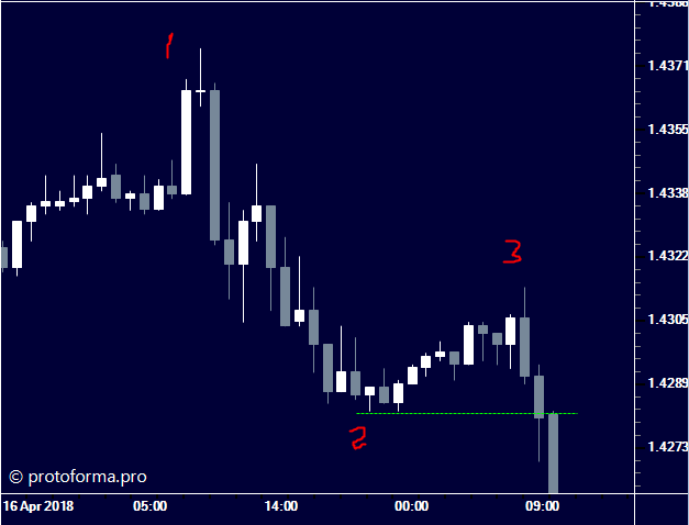 Буквально у Вас на глазах, все точки должны быть экстремумами, База модели это т.1-2-3, фиксируется в момент пробоя т.2 (сделал крупнее график):