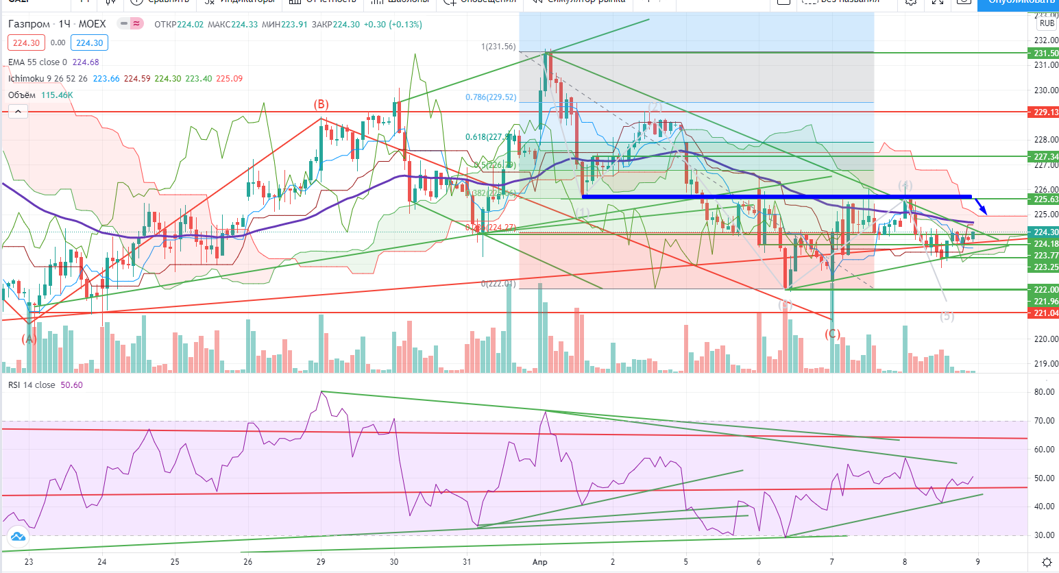 В Газпроме «на часах на 3-ей волне в волне С не было дивергенции, а значит ретест очень возможен. Поэтому в рамках интрадейной стратегии я решил торговать от зоны 225,4-226 со стопом 226,2+. Зона действует и сегодня». Да, действует и сегодня. В случае выхода наверх стоп однозначный, но лонг занимать не буду, т.к. в облаке Ишимоку.