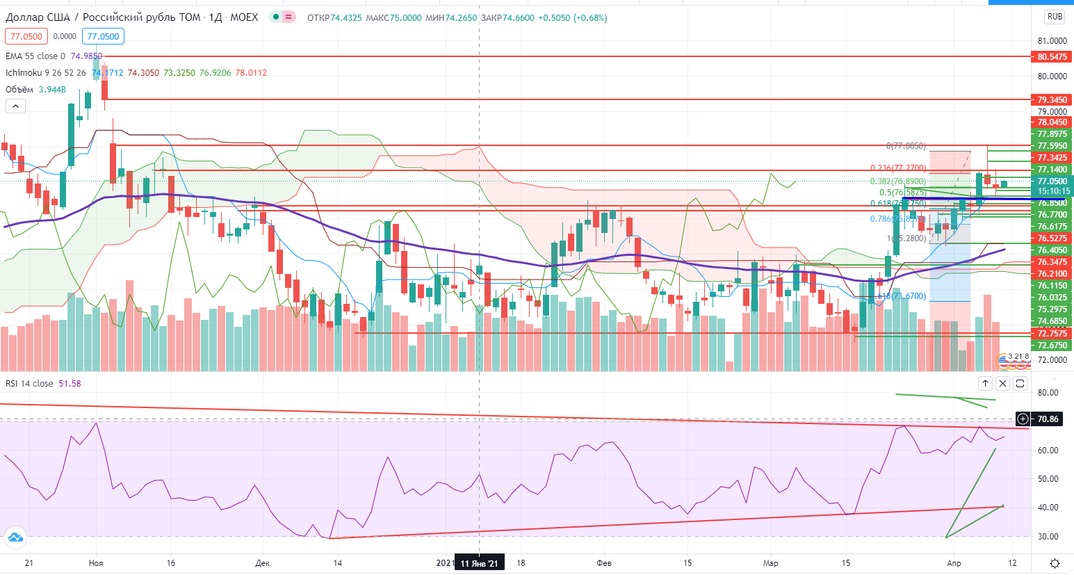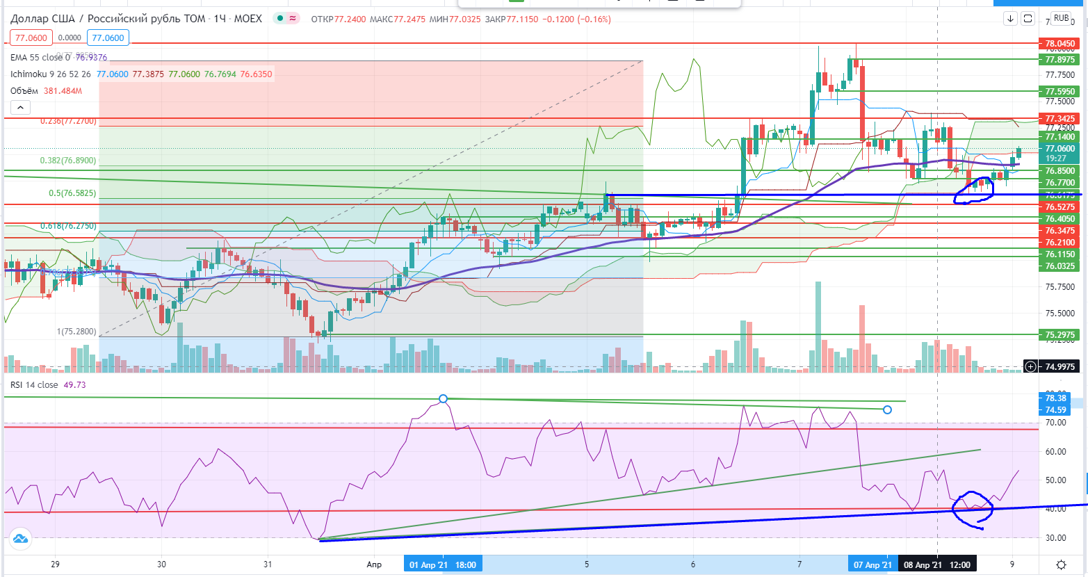 Также интрига для меня была вчера в паре USDRUB. Приходили к уровням на днях 76,57 и на часах на уровне 76,63 (RSI на тренде), я лично добавил лонга не фьючерсе, стоп кратчайший -76,5- на споте.