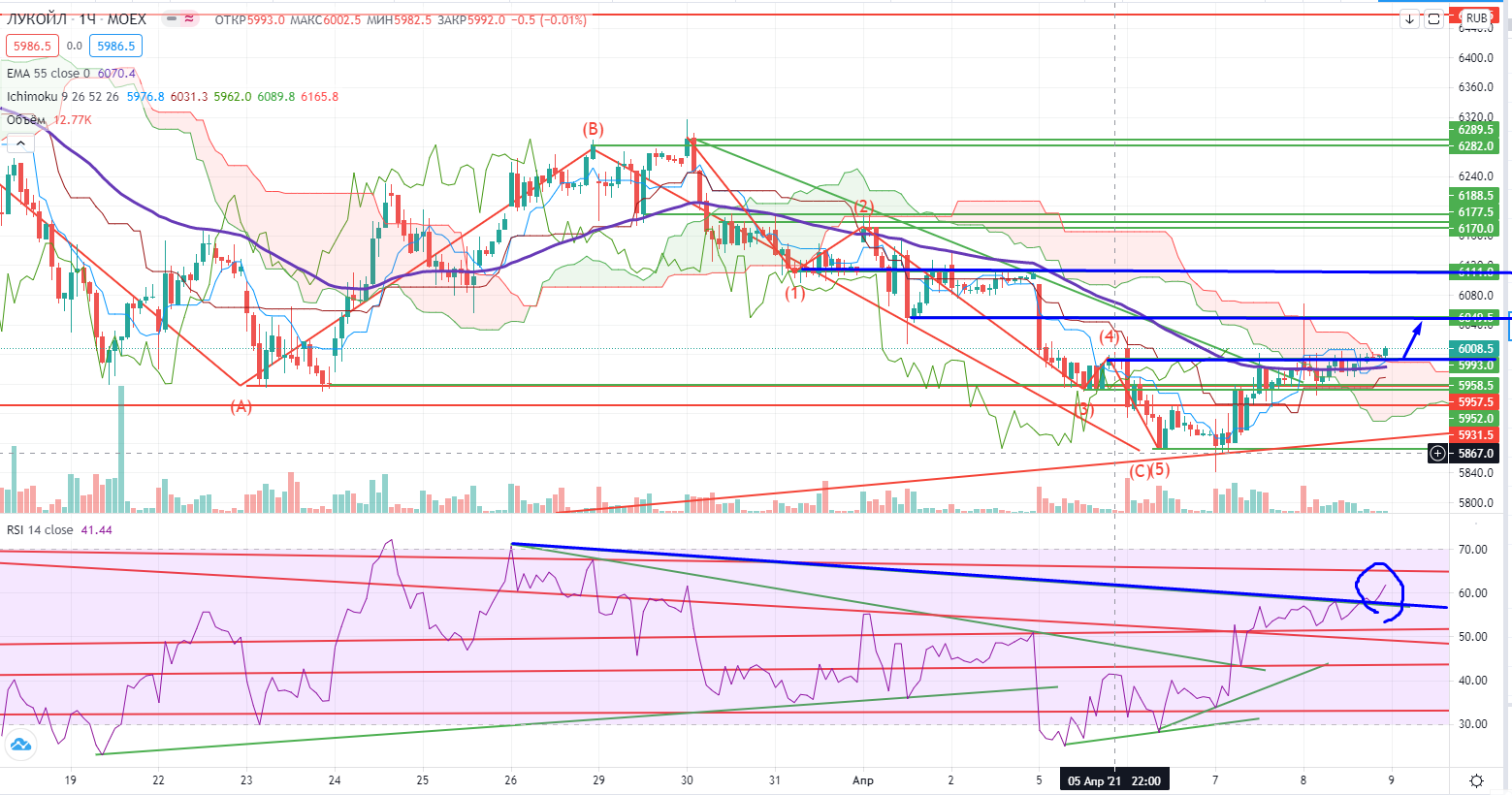 Я перевернулся в Лукойле на «вечерке» по 6003 (облако Ишимоку ниже и RSI пробивает свой тренд) , встал в спрэд «Покупка Лукойла-Продажа Газпрома» по деньгам Теперь я полностью спокоен. Стоп от лонга в Лукойле 5980- .