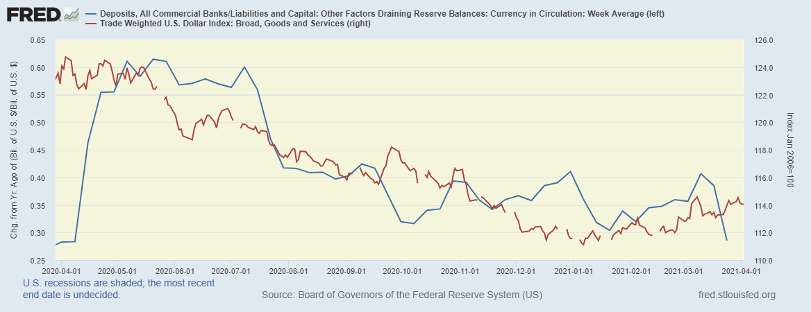Синяя линия – это соотношение депозитов к наличным деньгам, по сути, если отбросить нюансы, то это один из денежных мультипликаторов. И мы видим, что показатель резко снизился, что локально снова начало оказывать давление на доллар, который нанесен красной линией.