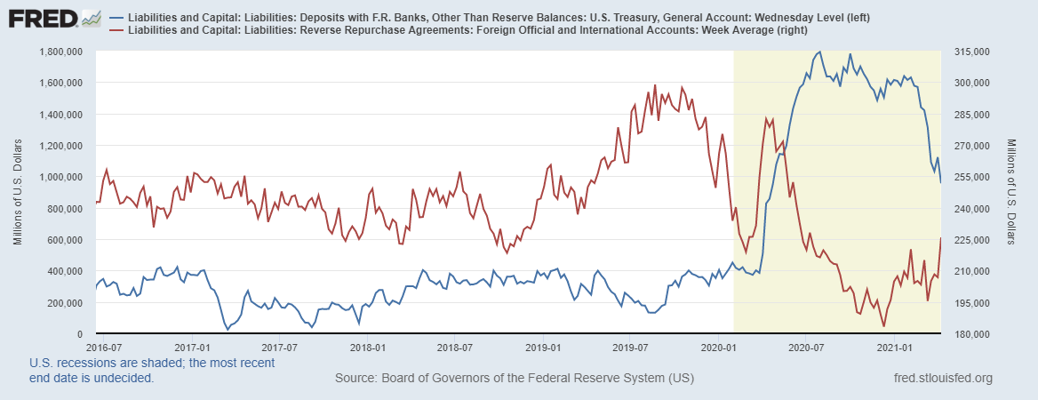 Синяя линия – счет Казначейства США в ФРБ. На текущей неделе счет сократился на 167 млрд долларов.