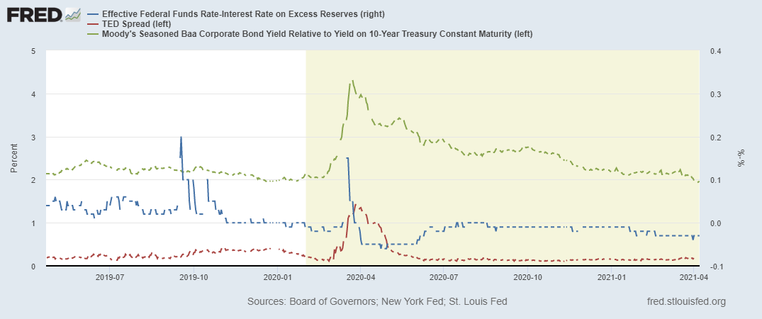 Зеленая линия – это разница между доходностью корпоративных 10-летних облигаций и соответствующих трежерис, ситуация на рынке корпоративного долга стабилизировалась ниже докризисных уровней, и на прошлой неделе показатель снизился еще.