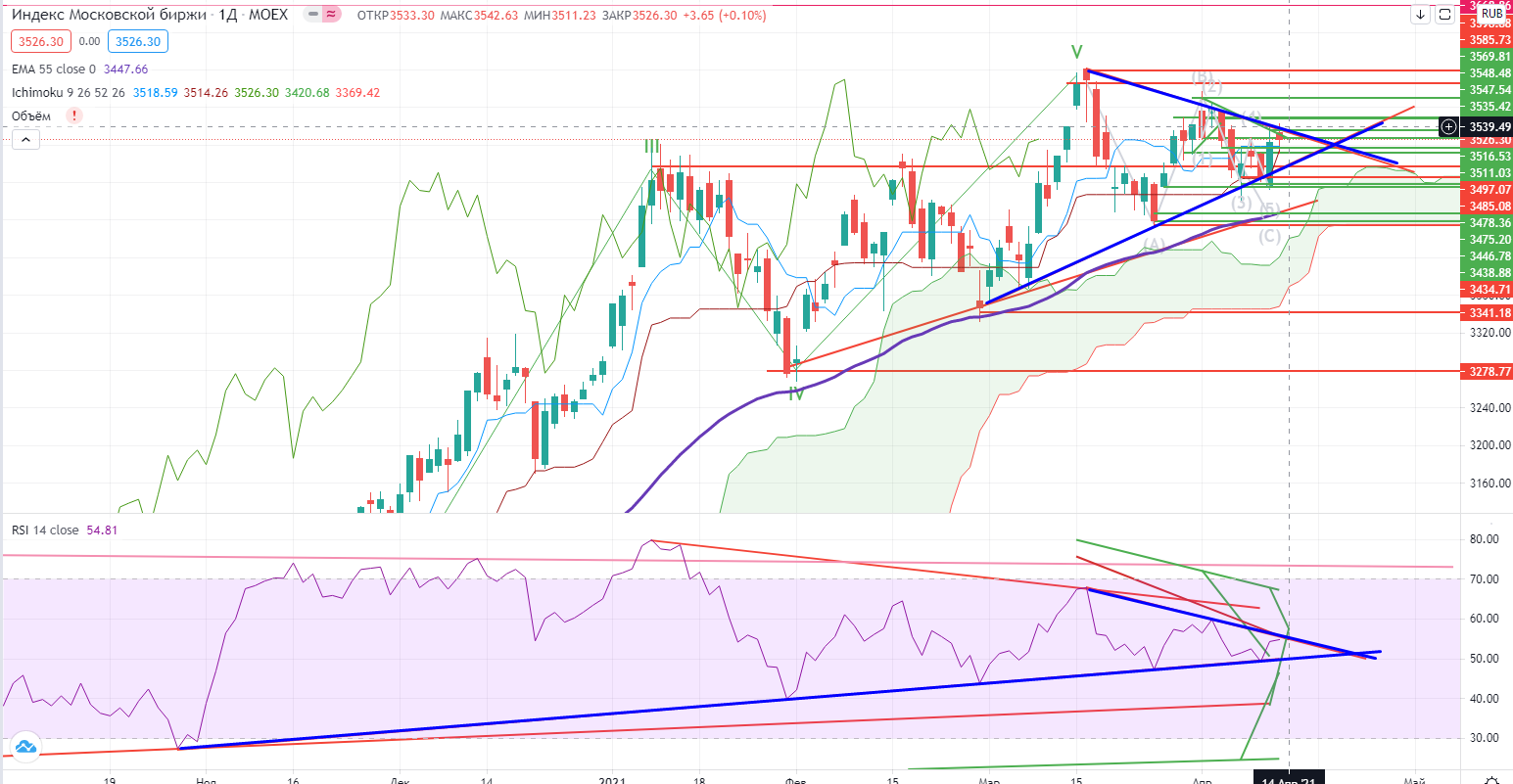 Индекс ММВБ почти никак не среагировал на происходящее, он заперт в треугольнике, RSI тоже… Интересно, что индекс, рассчитываемый в рублях, не особо отреагировал на новость о состоявшемся телефонном разговоре Путина с Байденом.