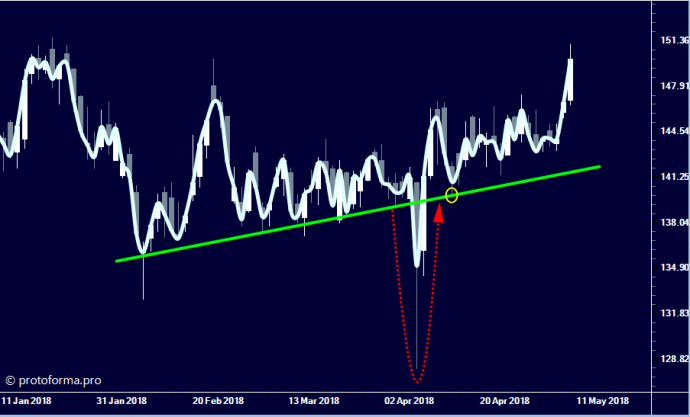 Есть устойчивый тренд и в моменте выходят "плохие" или глобальные или локальные новости, идёт массовый сброс акций, после этого цена резко ( это важно ) возвращается обратно над ключевыми уровнями и трендовой: