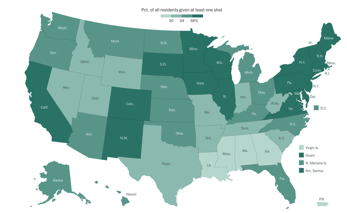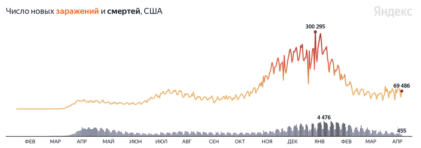 По данным Центра контроля и предотвращения заболеваемости на 12 апреля, около 120 млн человек в США получили минимум одну дозу вакцины. Это число также учитывает около 74 млн человек, которые полностью вакцинировались (~22,5% населения страны). В штатах на Юго-Востоке, Севере и Северо-Востоке страны вакцинировано по 40% населения.