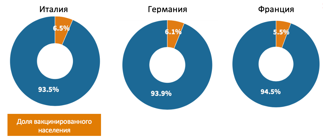 Объем вакцинированного населения в Европе отстает от США. По состоянию на 12 апреля 2021 года только объем вакцинированного населения не превышает и 7% в основных странах еврозоны против ~ 22,5% в США.