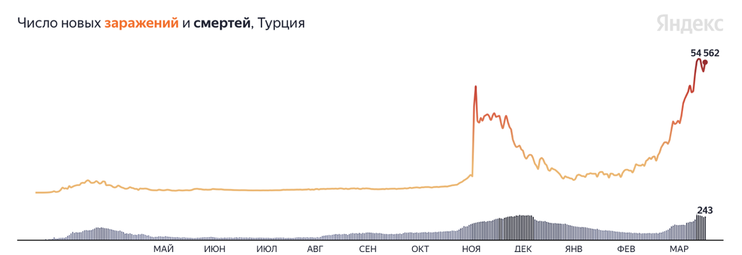 Динамика заболеваемости в туристических странах также оставляет желать лучшего. Например, Турция после отмены карантинных ограничений для туристов фиксирует ежедневные рекордные приросты заболевших. Динамика по смертности также ускоряется. Это может привести к повторным закрытиям границ.