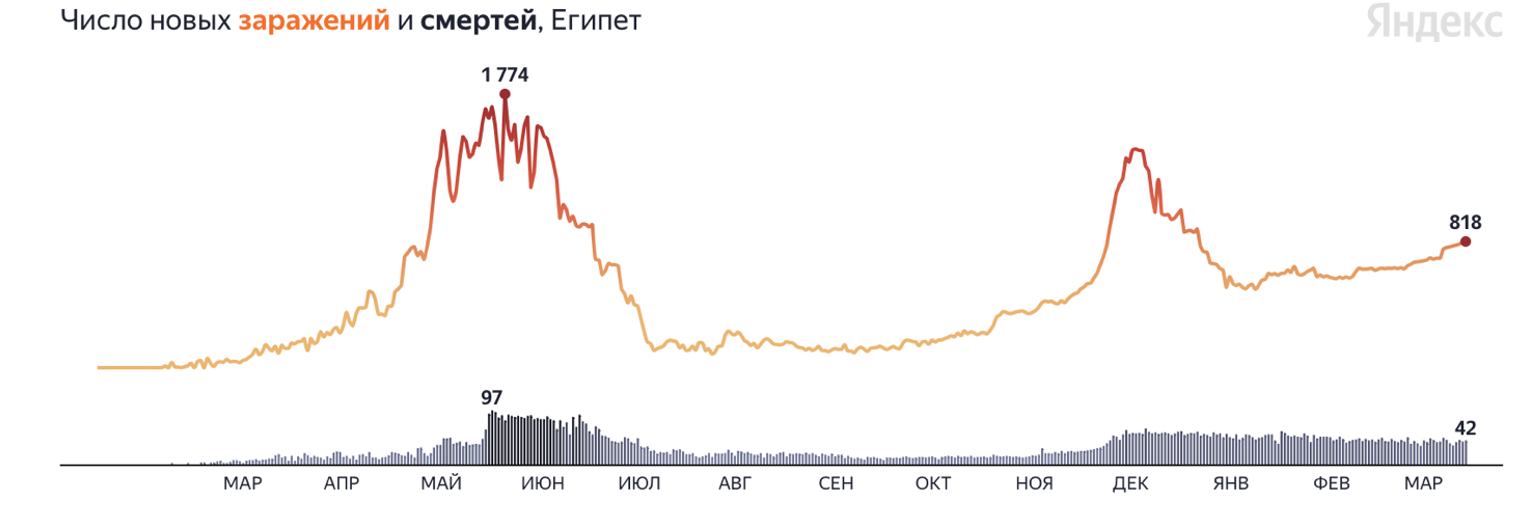 В Египте также наблюдается постепенное увеличение ежедневного прироста числа заболевших.