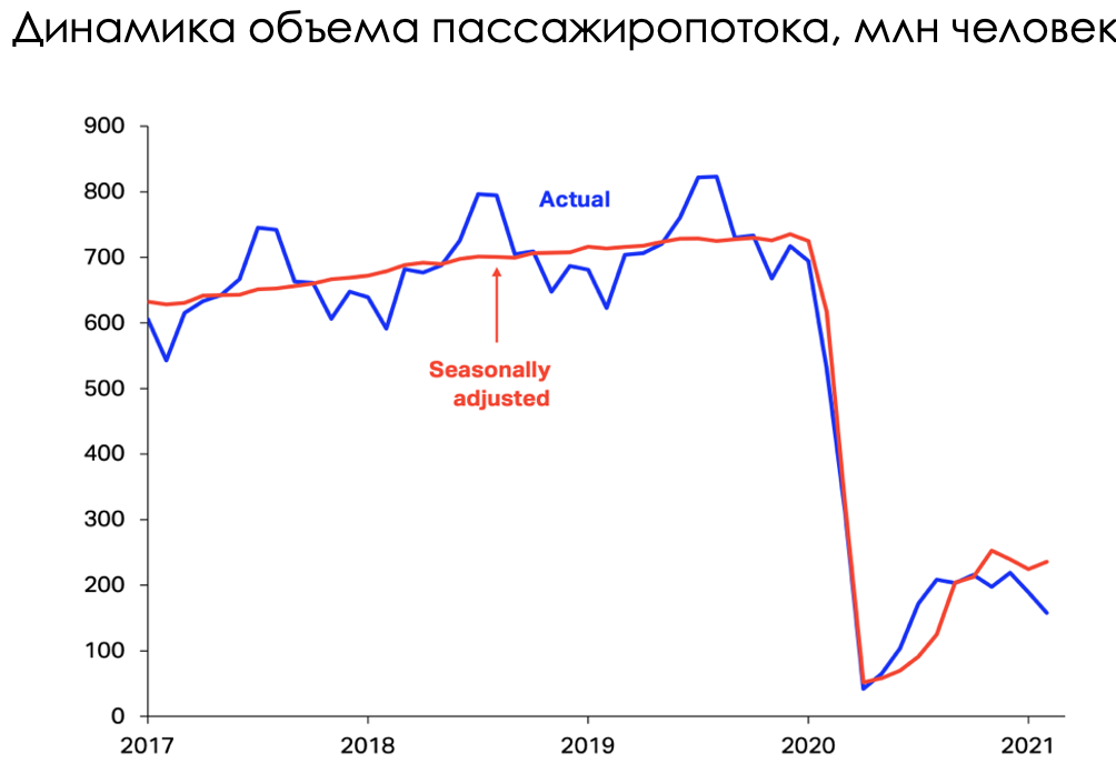 Одной из прокси переменных, по которой можно судить о медленном восстановлении как международного, так и внутреннего туризма в США — это объем авиационных перевозок. По данным департамента перевозок в США, спрос на путешествия воздушными перевозками восстанавливается крайне медленно. Также по данным IATA, мировые авиаперевозки увеличиваются очень вяло, а США занимает около 30% всего мирового объема перевезенных пассажиров. Таким образом, мы делаем вывод, что спрос на один из наиболее популярных средств передвижения пока что слабый в стране.