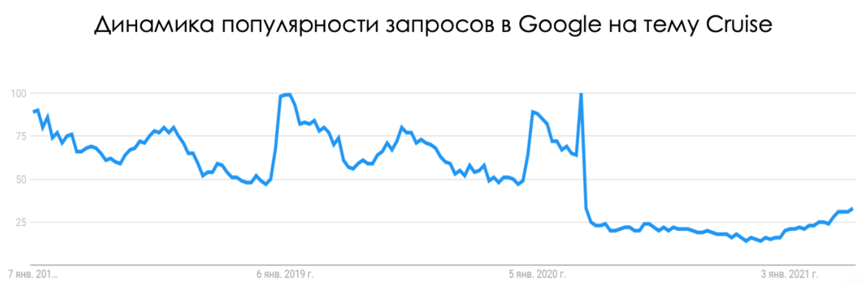 Несмотря на ожидания высокой доли вакцинированного населения в США в период сезона отпусков, уровень запросов в интернете на морские путешествия восстанавливается крайне медленно. Популярность поисковых запросов по слову Cruise находится чуть выше уровня апреля 2020 года.