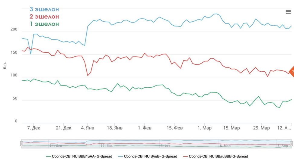 На графике видно, что в конце декабря произошли активные покупки в ОФЗ и 1-2 эшелонах, а в 3-ем были слабее, поэтому спред в этом эшелоне расширился по сравнению с первыми двумя.
