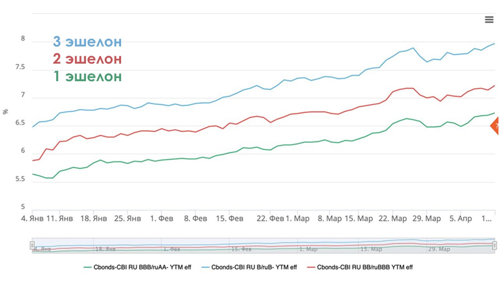 Дело в том, что на долговой рынок с начала года вышли компании с новыми облигационными займами, преимущественно из 3-го эшелона: в январе заняли 4 млрд руб., в феврале 280 млрд руб. и в марте 174 млрд руб.
