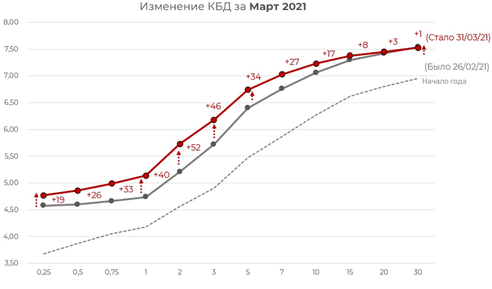 Доходности на рынке ОФЗ в марте вдоль всей кривой выросли от 1 до 52 бп, а цены снизились, т.к. при росте доходности облигации падает её цена.