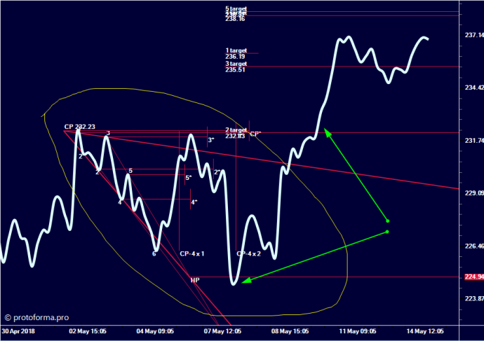 Здесь можно входить в двух местах это от уровня НР, этот вход выглядит более соблазнительным, есть свои нюансы. Или на пробой уровня т.1 в направлении основного тренда. Подтверждением может выступить любой из Ваших любимых инструментов, я юзаю сценарии и протоформы, рассчитанные Экспертом ТА :
