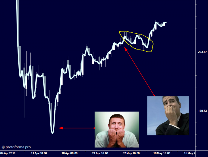 В том посте «не хватило места» обратить внимание на некоторые моменты торговли . На «дне» войти боязно (напомню падение случилось после ввода санкций + сбер был перегрет), а когда цена уже значительно отскочила есть глубокие сомнения, что мол в любой момент может быть откат или разворот (обведённый участок будет рассмотрен ниже) :