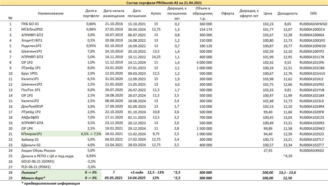 При этом на 5 мая запланировано размещение облигаций сельхозпредприятия «Маныч-Агро», бумаги войдут в портфели на 3-4% от активов.