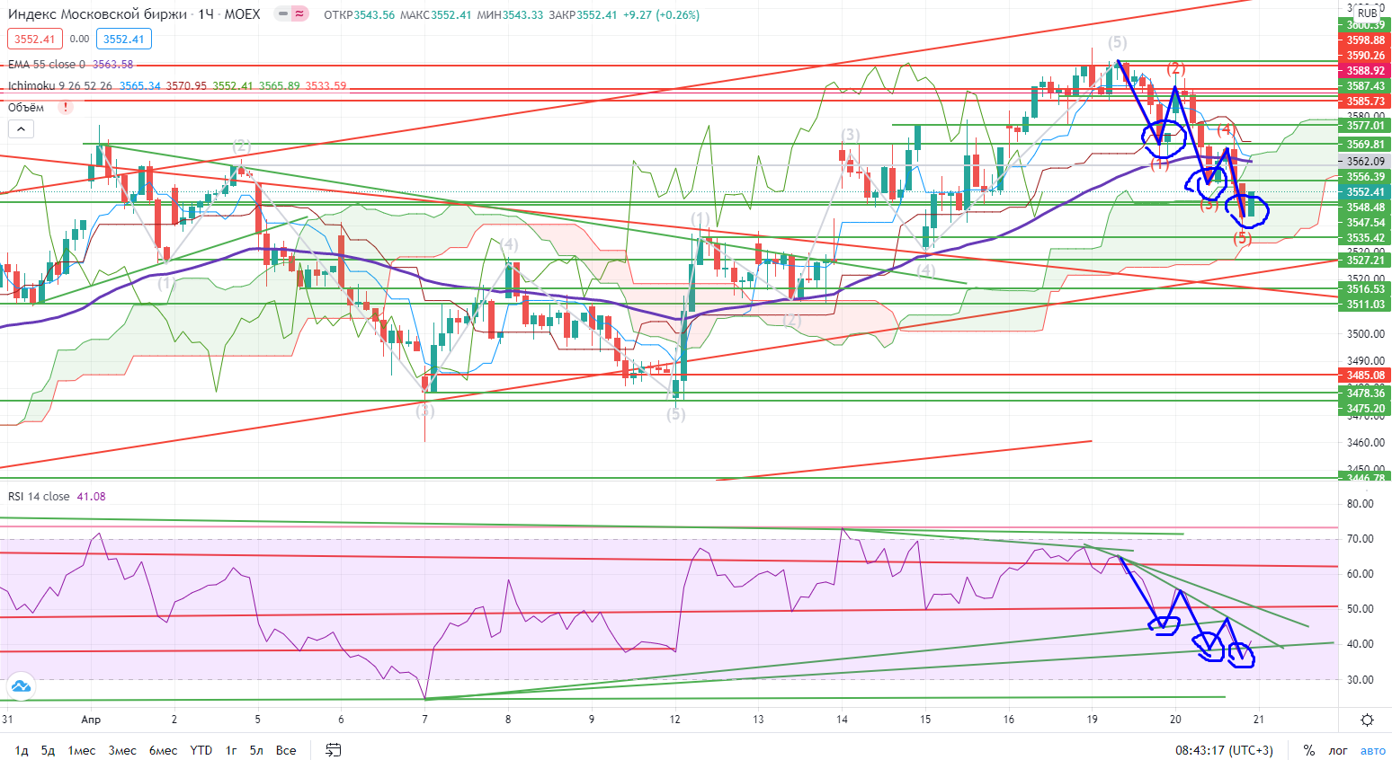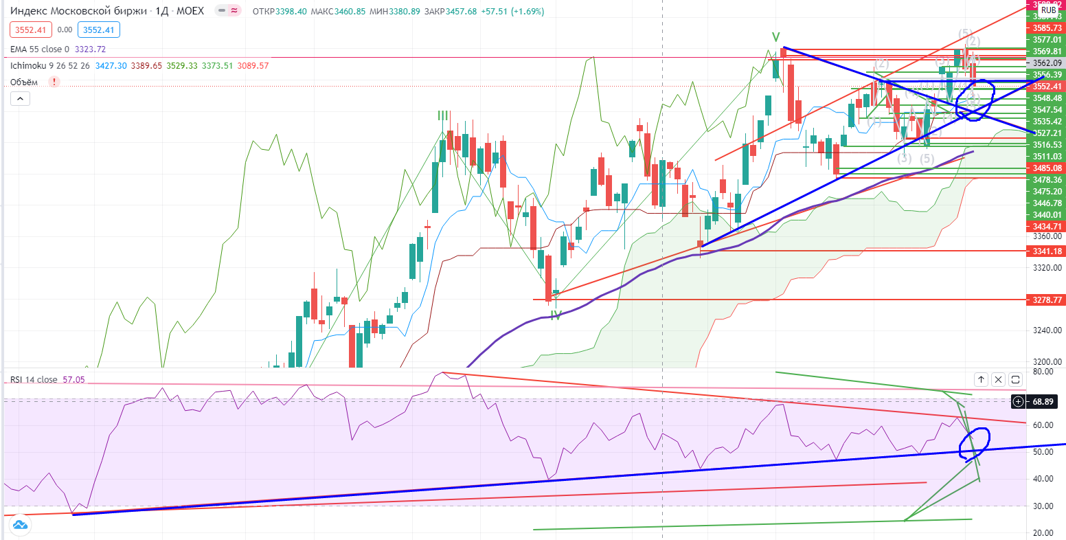 На днях Индекс ММВБ сформировал двойную вершину с дивергенцией, пробил локальный уровень поддержки 3558.