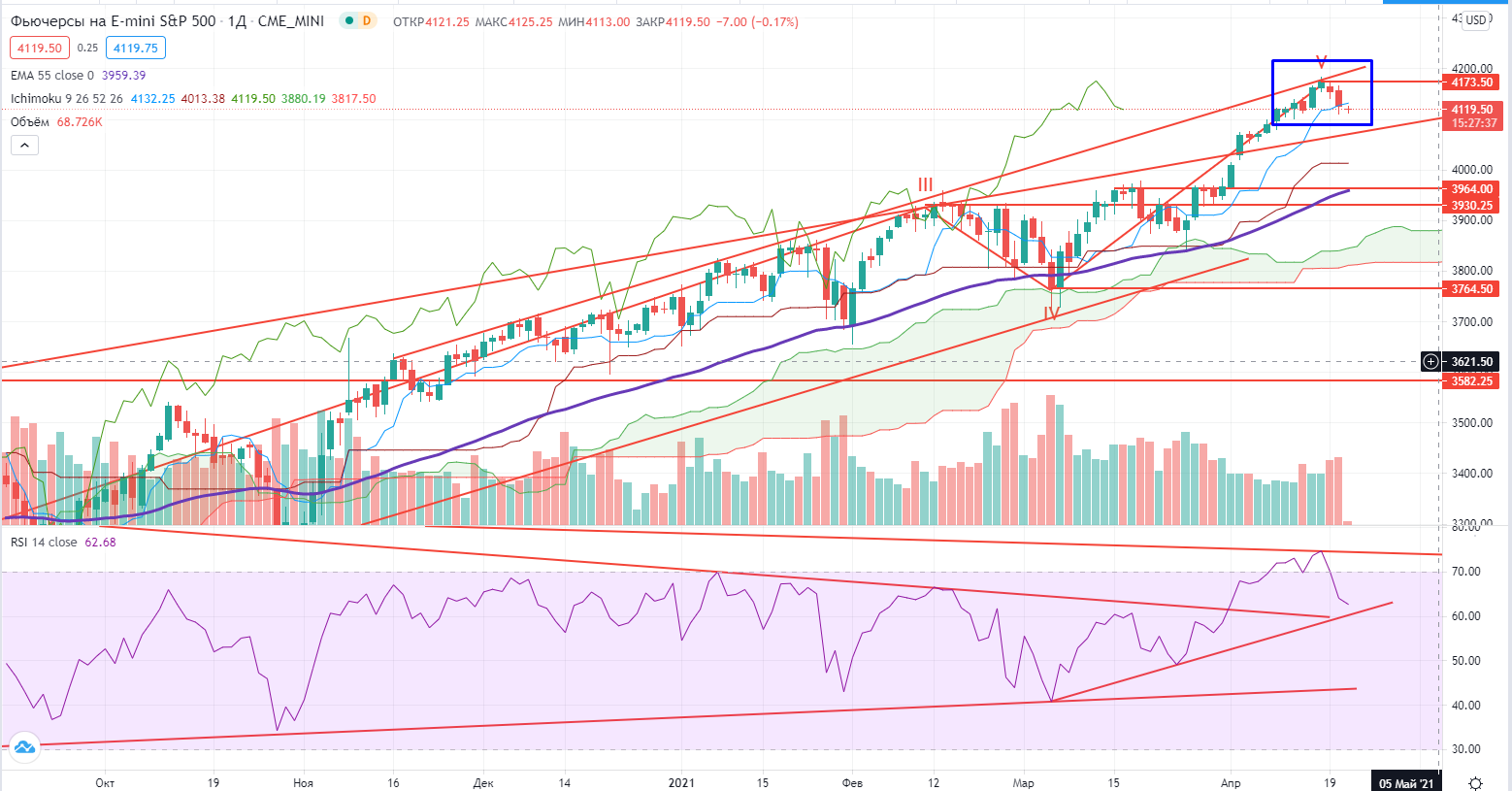 Фьючерс на S&P пока скромно, но начал припадать. Пока даже о начале коррекции говорить рано, но по крайней мере черная свеча перекрыла несколько мелких белых свечей роста… Но наш рынок не особо реагирует пока на это, по крайней мере у нас своих проблем хватает, но начало коррекции нельзя отнести к положительному моменту..