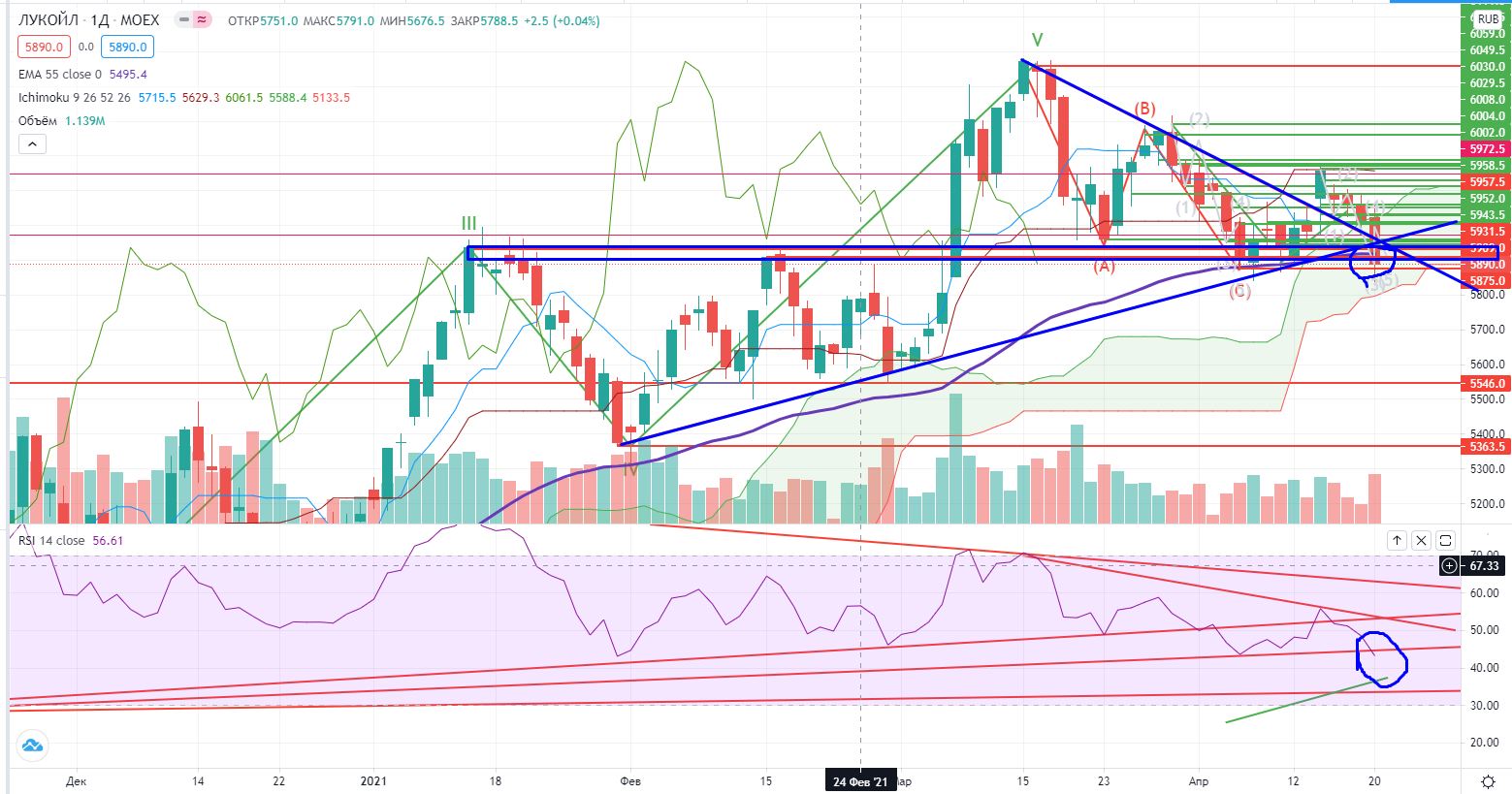 Очень непростая ситуация в Лукойле на днях. Он прошел ниже трендов, и пробивал в моменте горизонтальный поддержки 5900+-, но в итоге не сильно. RSI пришел на тренд. А вот если сегодня он ее пройдет, то может войти вообще в падающий downtrend.