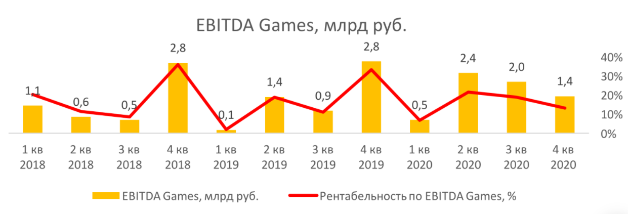 Вместе с этим EBITDA игрового сегмента в 4 кв. 2020 г. снизилась на 48,7% г/г до 1,4 млрд руб. Рентабельность по EBITDA составила 13% против 32% в 4 кв. 2019 г. Это было связано с инвестициями в удержание пользователей, приобретенных на фоне COVID-19, и привлечение новых пользователей вследствие все еще высокого спроса при продолжении частичной блокировки по всему миру.