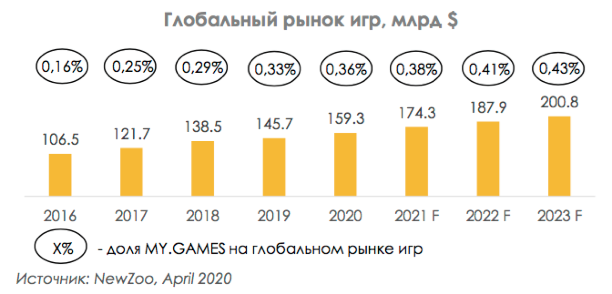 По данным NewZoo, рост глобального рынка игр в 2021 г. составит 9,4% г/г. Соответственно, с учетом постоянного увеличения доли Mail.ru на рынке, мы ожидаем темпы роста выручки игрового сегмента выше рыночных.