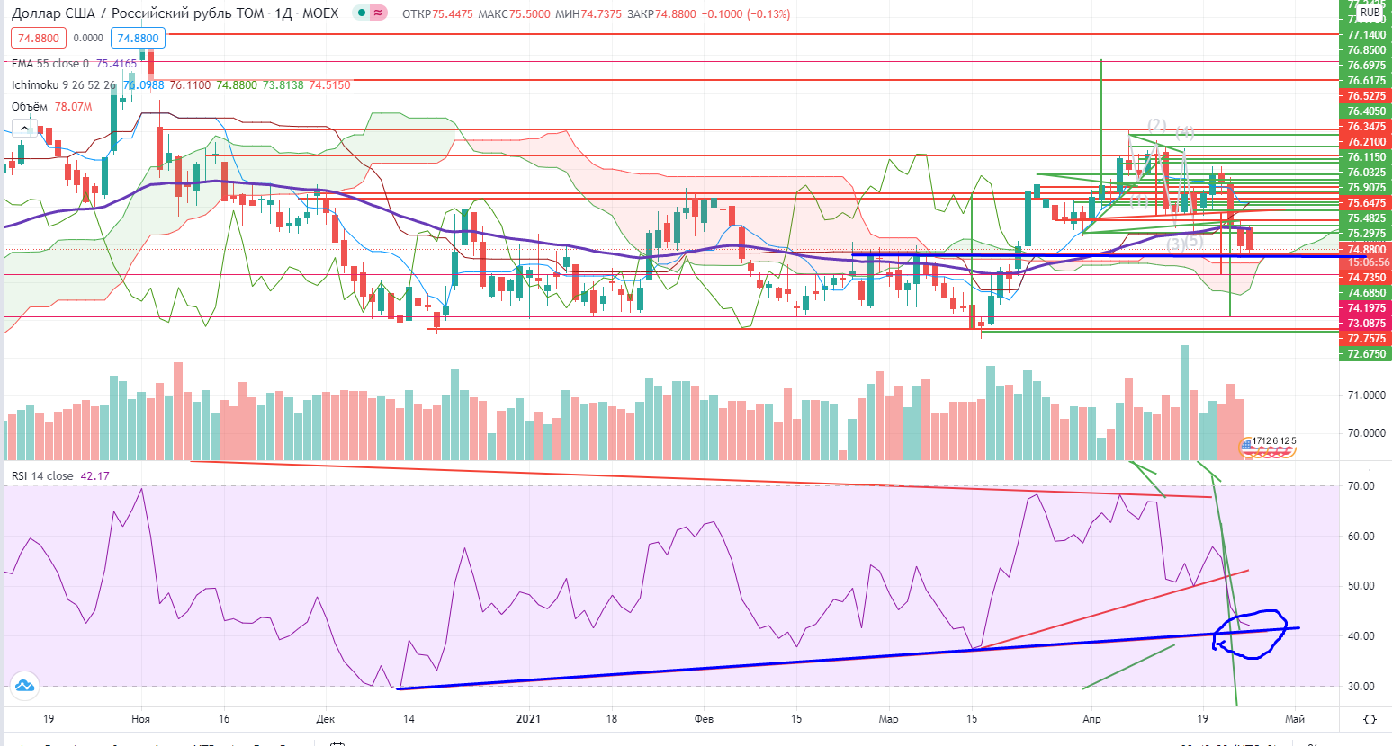 Пара USDRUB на днях пришла к горизонтальному уровню поддержки 74,7-74,75 и RSI почти на тренде.. Локально можно наверное покупать, стоп рядом, но пока боязно. Ставку повысили, начало налогового периода и временное потепление внешнего фона, также достаточно высокая цена на нефть и падающий в моменте доллар-вот несколько причин возможного укрепления рубля. А против-страх санкций и невыгодность крепкого рубля для нашего государства. Но рынок очень нервный и в случае почти любого «шухера» может снова начать расти…