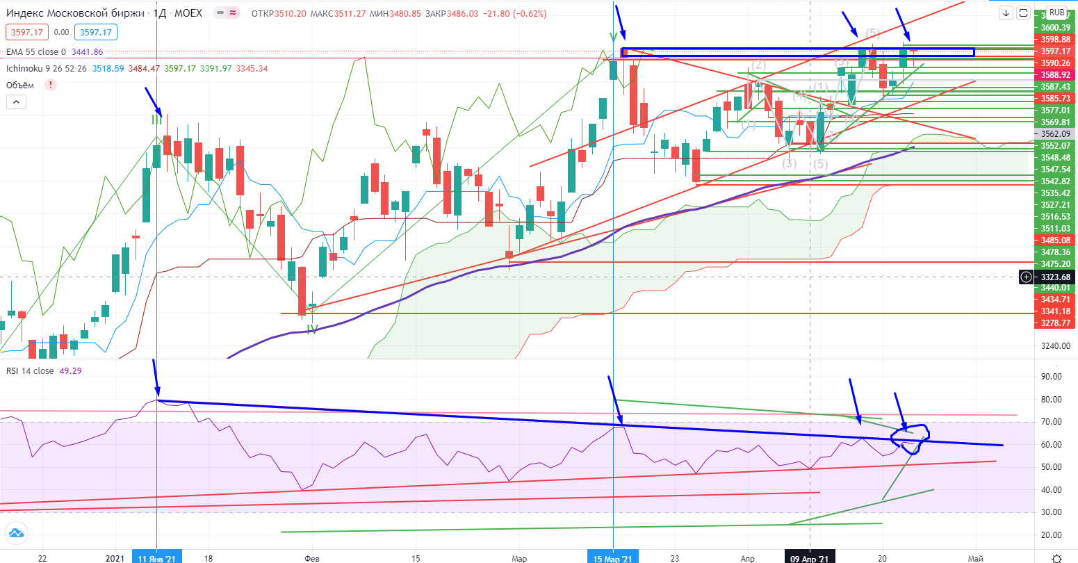 Более того, может так случиться, что наш рынок может отсюда вообще пойти вниз (все-таки он хоть и находится на хаю, но все равно это пока боковой канал, и мы находимся у верхней границы…). Все свои сомнения я высказал ранее ( https://www.finam.ru/analysis/marketnews/soxranyaetsya-intriga-v-nefti-20210423-09400/), и пятница их не разрешила.