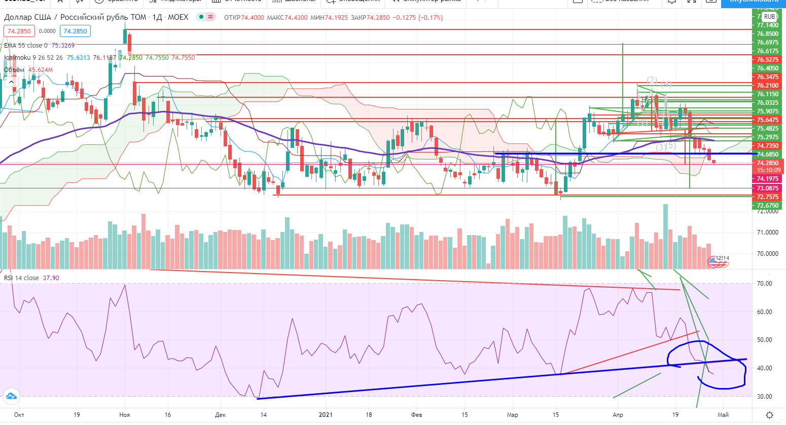 USDRUB тем временем пробила дневную поддержку 74,7, RSI также пробивает свой тренд… Нужно быть очень осторожным в спекулятивном долларе, может произойти отдача… Но запас хода не такой большой по сравнению с возможным выкосом наверх, так что прибыль/риск не такой большой… Короче говоря спекулятивно я не торгую «за рубль» и стратегический лонг доллара держу…