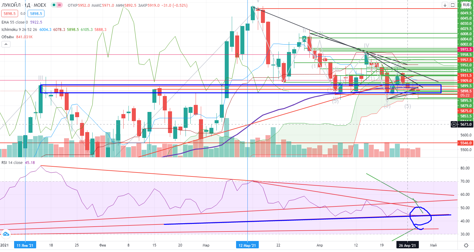 А Лукойл на днях пока не пробивает зону поддержки (в очередной раз), но находится внутри этой зоны (5890-5937), «голый» шорт (как и лонг)-опасен, но в спрэде оставаться все же можно!!!