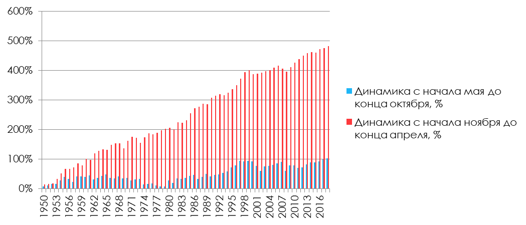 С 1950 года в 64% случаев с конца апреля до конца октября динамика была хуже, чем с конца октября по конец апреля — то есть правило подтверждается, но только в 64% случаев.