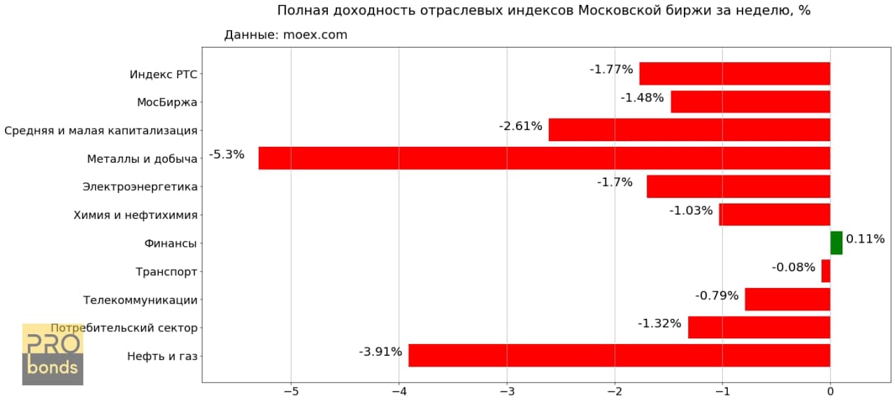 Единственный отраслевой индекс, закончивший неделю с положительной доходностью: индекс финансов (+0,11% н/н, +34,39% с начала года)