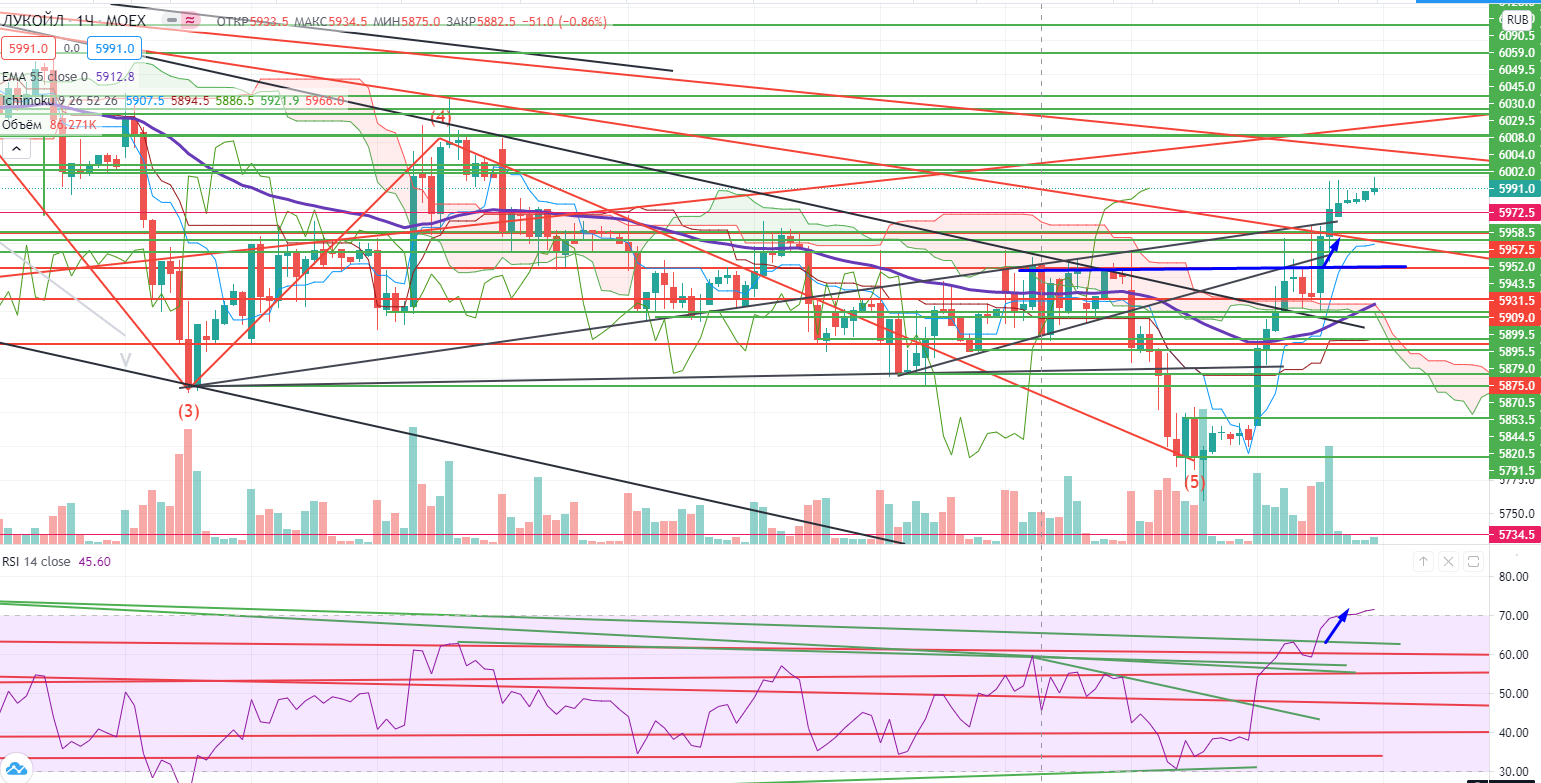 Сначала дня я его шортил, как и писал накануне (https://www.finam.ru/analysis/marketnews/rost-nefti-mozhet-uderzhat-rossiiyskiiy-rynok-ot-padeniya-20210504-09400/) . Но в середине дня я дал такую рекомендацию на своем телеграмм-канале ( t.me/scalpon ) — «В Лукойле образовался уровень 5933,5. Цена находится выше облака, т.е. предпочтение лонгу. Но уровень, на то и уровень, что от него можно торговать в любую сторону. В шорт я лично пока не буду торговать, а вот от лонга при проходе и закреплении выше можно пробовать со стопом 5920-».